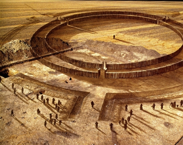Ricostruzione della grande struttura a pianta concentrica di Těšetice-Kyjovice (Repubblica Ceca), cultura morava a Ceramica dipinta del secondo terzo del V millennio a.C.