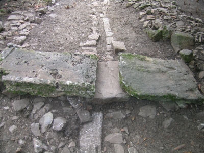 Questa soglia e i gradini della scalinata interna sono tra i pochi resti relativi ai piani pavimentali antichi. La mancanza dei piani di calpestio, tuttavia, ha permesso di documentare le canalizzazioni che formavano l’efficiente sistema fognario dell’edificio. Gli ambienti posti ai lati dell’ingresso (vani C, D, E ed R) probabilmente non erano frequentati direttamente dai padroni di casa, ma accoglievano al loro interno tabernae aperte verso la strada o attività produttive gestite dal personale di servizio, come sembrerebbe indicare la presenza di una piccola vaschetta di lavorazione rinvenuta all’interno del vano D. Il settore centrale dell’abitazione era costituito da un ampio cortile rettangolare porticato, di cui si conserva anche parte del lastricato.